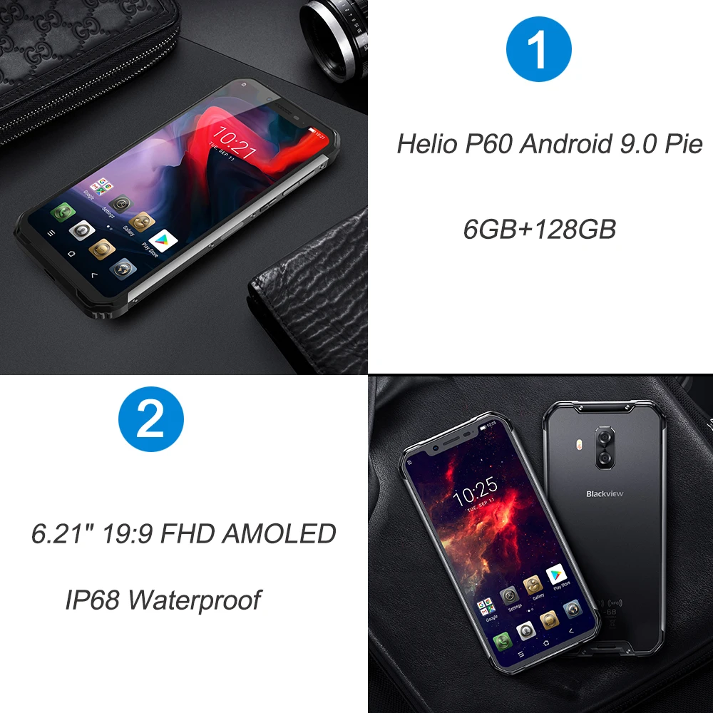 | Blackview BV9600 Pro IP68 Waterproof Mobile Phone Helio P60 6GB+128GB 6.21 19:9 AMOLED 5580mAh Android 9.0 Rugged Smartphone |