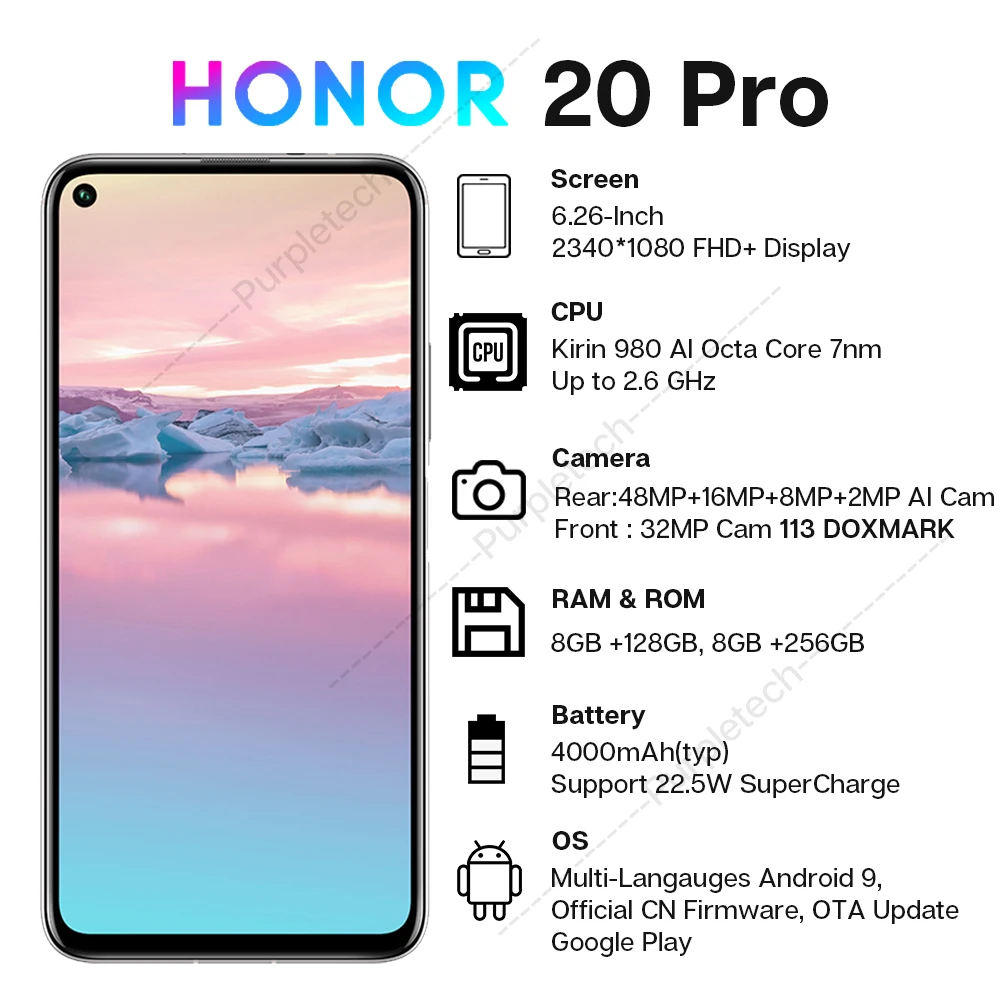 | HONOR 20 Pro Google Play Smartphone 6.26''8GB 128GB Kirin 980 Octa Core GPU Turbo3.0 4000mAh 48MP Camera Mobile Phone Android 9 |
