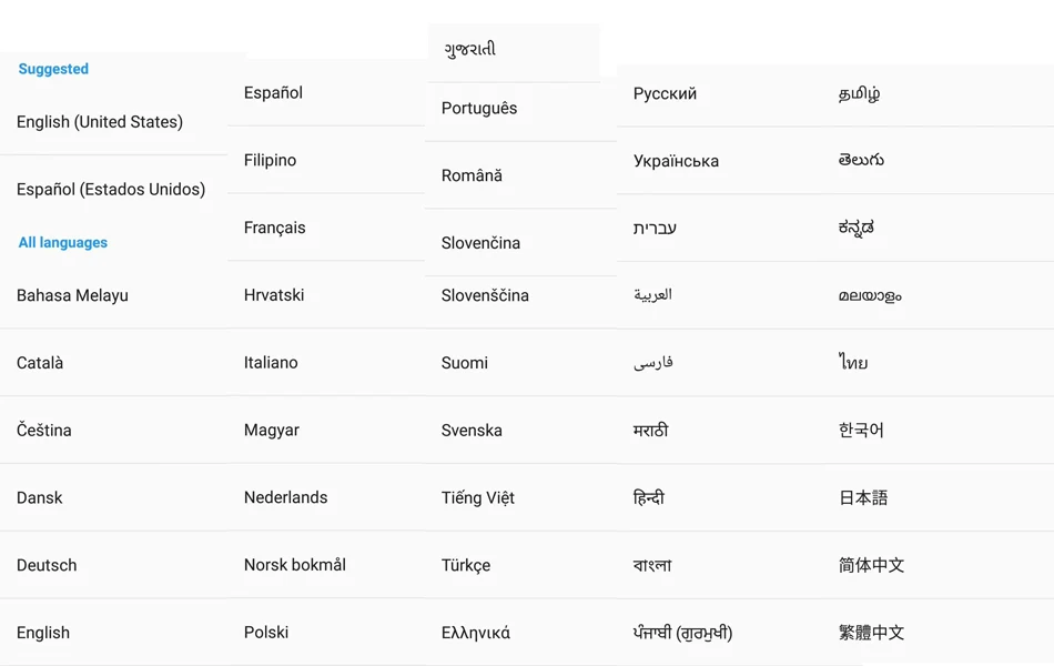 Russian, Bahasa Indonesia, Bahasa Melayu, Catalan, Czech, Danish, German, Estonian, English, Spanish, Filipino, French, Croatian, Italian, Latvin, Lithuanian, Hungarian, Nederlands, Norwegian, Polish, Portuguese, Romanian, Romansh, Slovenian, Slovak, Finnish, Swedish, Vietnamese, Turkish, Greek, Bulgarian, Serbian, Ukrainian, Armenian, Hebrew, Urdu, Arabic, Persian, Hindi, Bengali, Thai, Burmese, Cambodian, Korean, Traditional/Simplified Chinese
