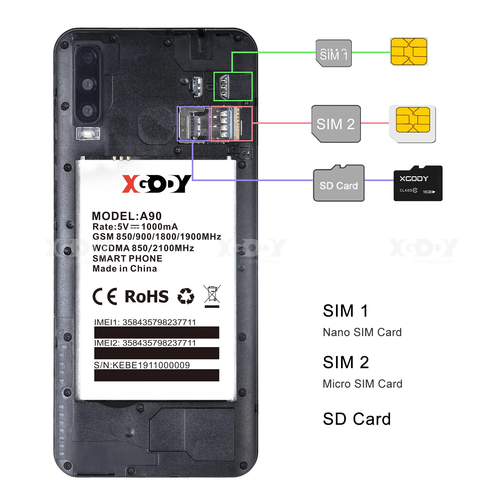 | XGODY 3G Mobile Phone Android 9.0 6.5inch 19:9 Full Screen 2GB 16GB MTK6580 Quad Core 5MP Camera 2700mAh A90 Smartphone |