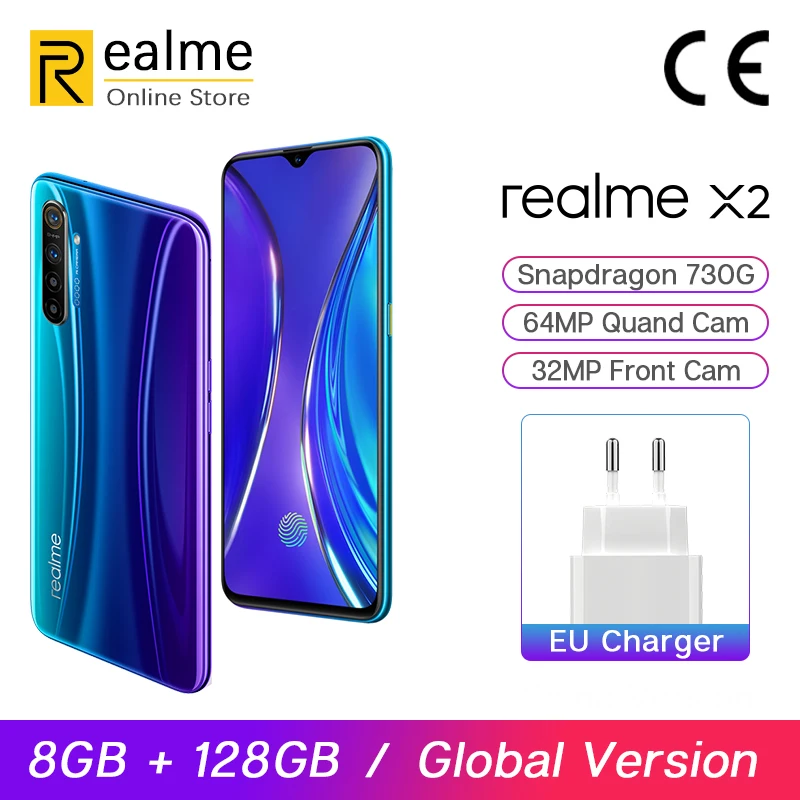 | In Stock Global Version Realme X2 X 2 8GB 128GB Snapdragon 730G Smartphone Octa Core 64MP Quad Cams 6.4'' NFC Cellphone 30W VOOC |