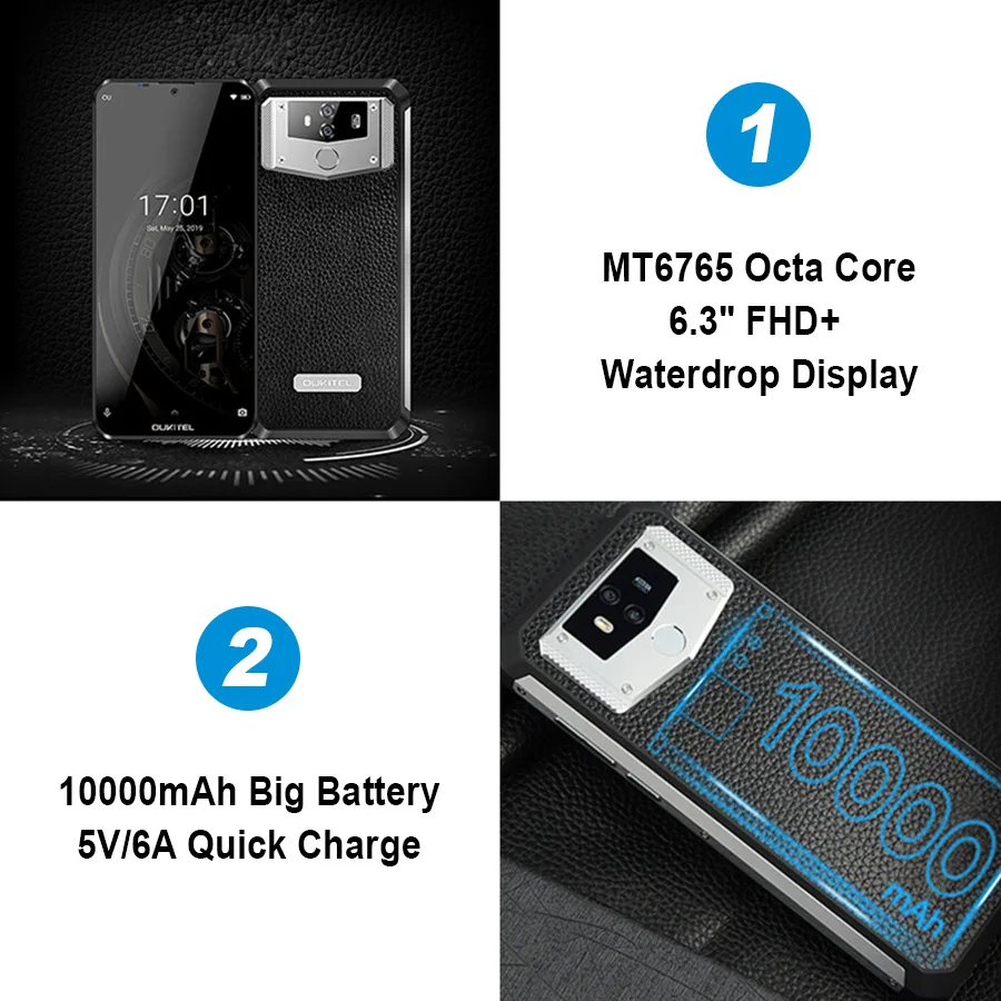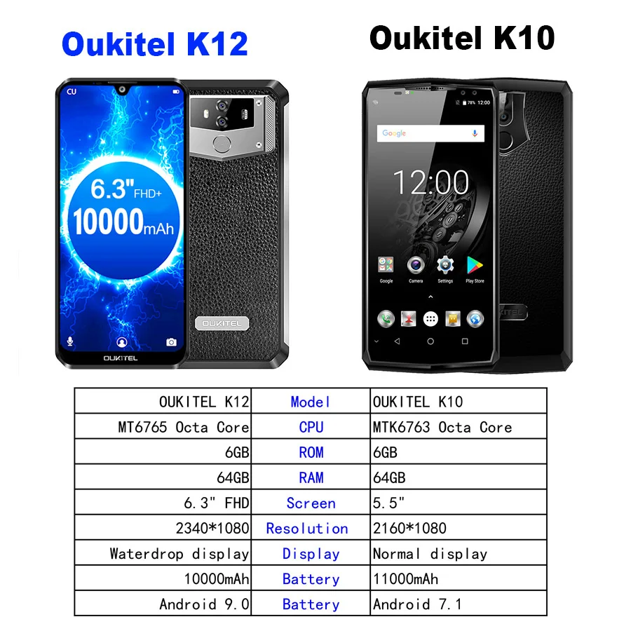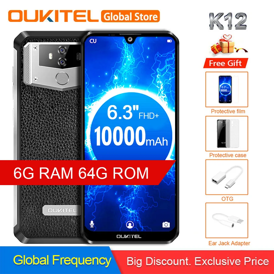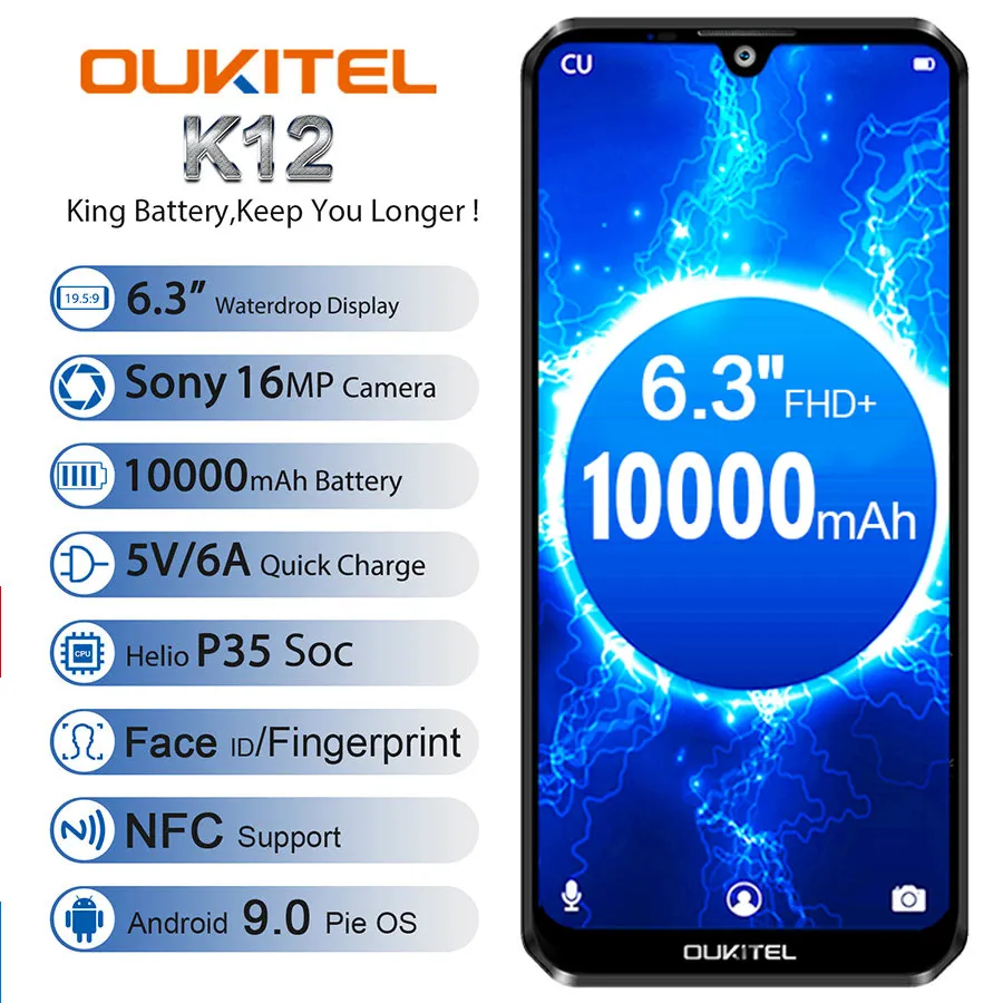 | OUKITEL K12 Waterdrop 6.3 FHD+ Android 9.0 1080*2340 16MP Smartphone 6GB 64GB Face ID 10000mAh 5V/6A OTG NFC Mobile Phone |