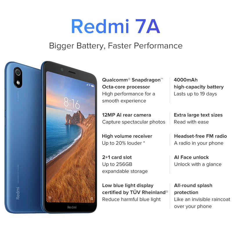 Redmi 7A phone, it comes with enhanced splash resistance, protected by splash-proof nano-coating *. Water works from the phone like a leaf, effectively reducing corrosion of sweat, oils, beverages or other splashed liquids. Your personal intelligent voice assistantOrganize trips, check the weather, control smart devices at home, etc.Rheinland® Certified Low Blue Light Display