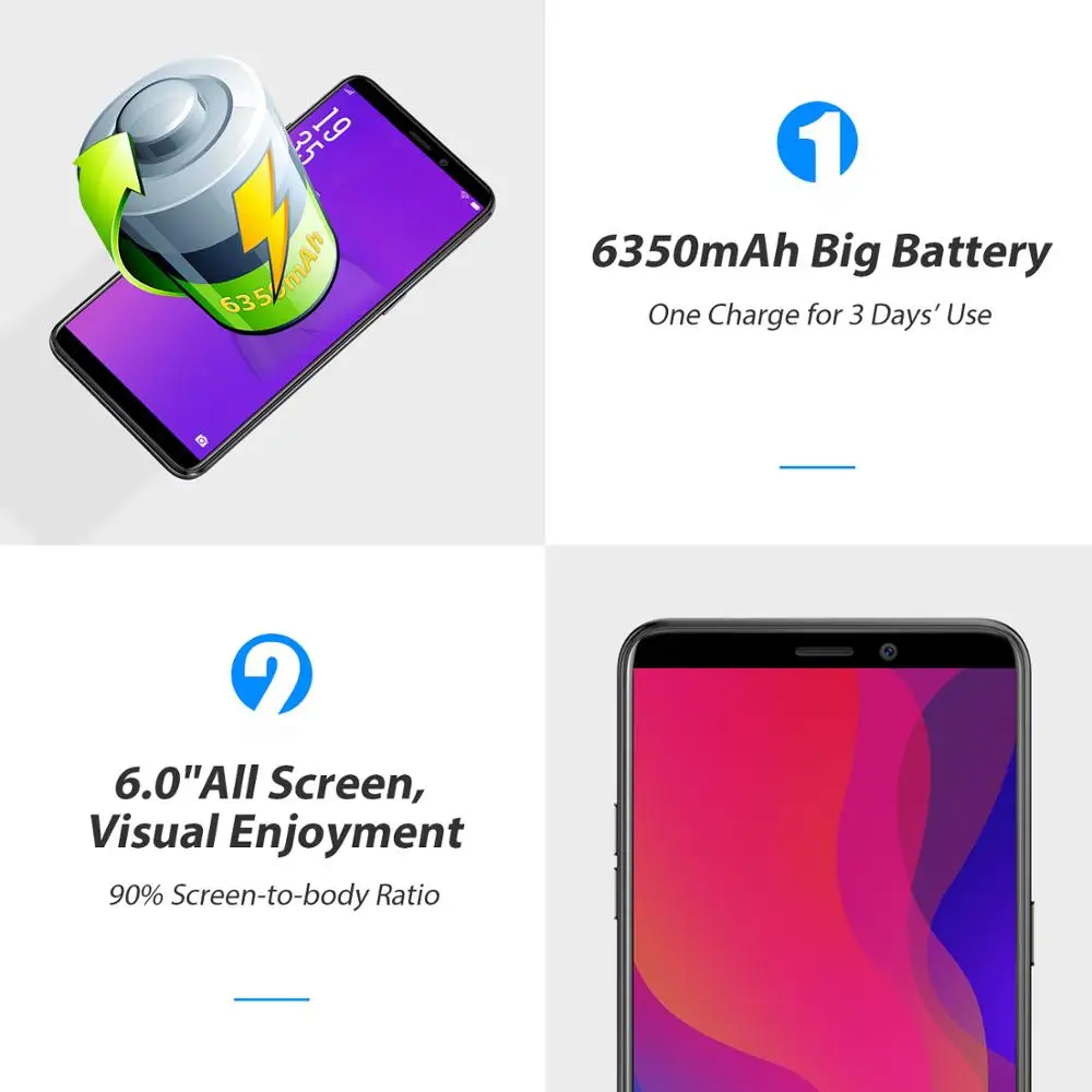 | Vernee X2 6.0 inch 6350mAh cellphone 4G LTE Quick Charge 3GB RAM smartphone Android 9.0 Dual SIM Face ID |