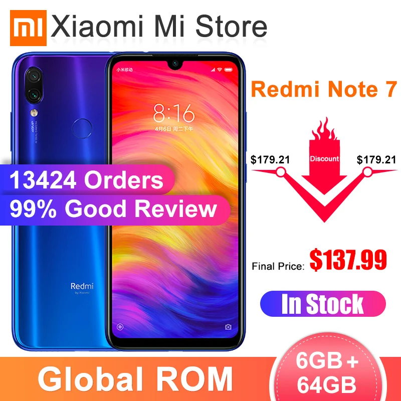 | In Stock Global ROM Xiaomi Redmi Note 7 6GB RAM 64GB ROM Smartphone Snapdragon 660 6.3 Screen 48MP Rear Camera 4000mAh Battery |