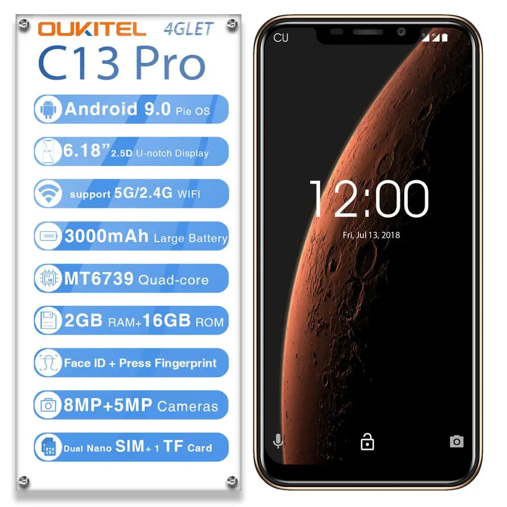 | OUKITEL C13 Pro 4G Smartphone 5G/2.4G WIFI 6.18 19:9 2GB 16GB Android 9.0 MT6739 Quad Core Face ID Fingerprint Mobile Phone |