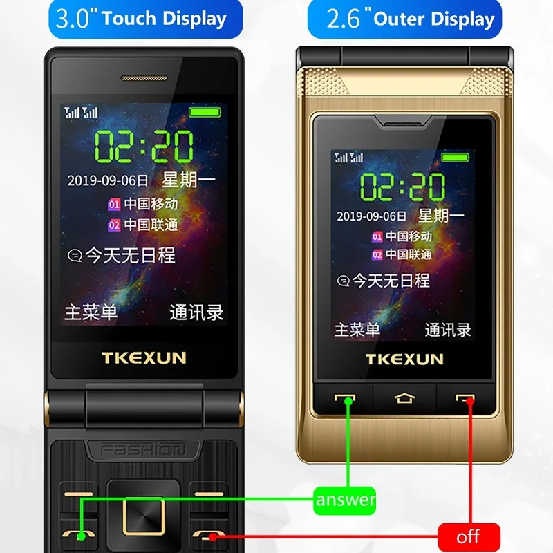 | Tkexun Free Case Dual Screen Touch 2.8 Display Dual Answer Blacklist Quick Dial SOS Call Large Key Flashlight Flip Mobile Phone |
