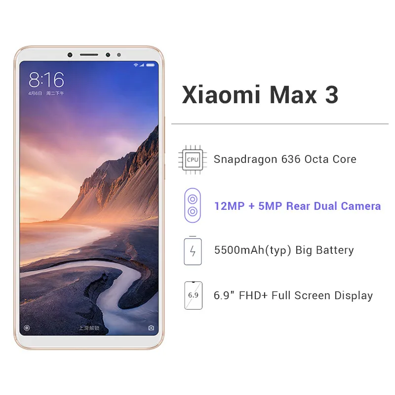 | Xiaomi Mi Max 3 6GB RAM 128GB ROM Mobile Phone Snapdragon 636 Octa Core 6.9'' Full Screen 5500mAh 12MP+5MP B4 B20 |