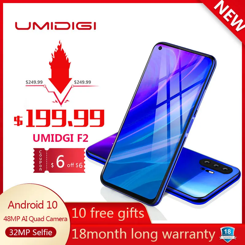 | UMIDIGI F2 Phone Android 10 Global Version 6.53 FHD+ 6GB 128GB 48MP AI Quad Camera 32MP Selfie Helio P70 Cellphone 5150mAh NFC |