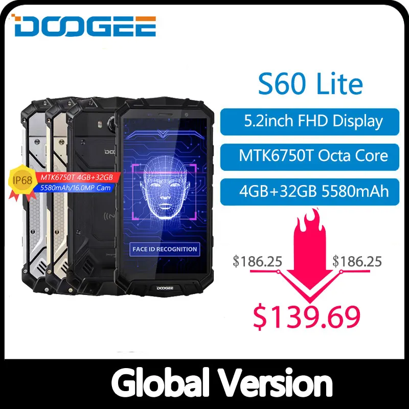 | DOOGEE S60 Lite IP68 Wireless Charge Smartphone 5580mAh 12V2A Quick Charge 16.0MP 5.2'' FHD MTK6750T Octa Core 4GB RAM 32GB ROM |