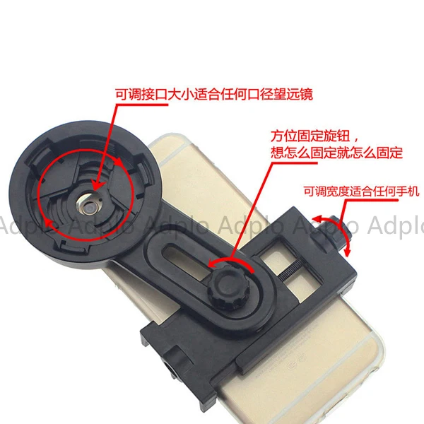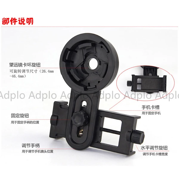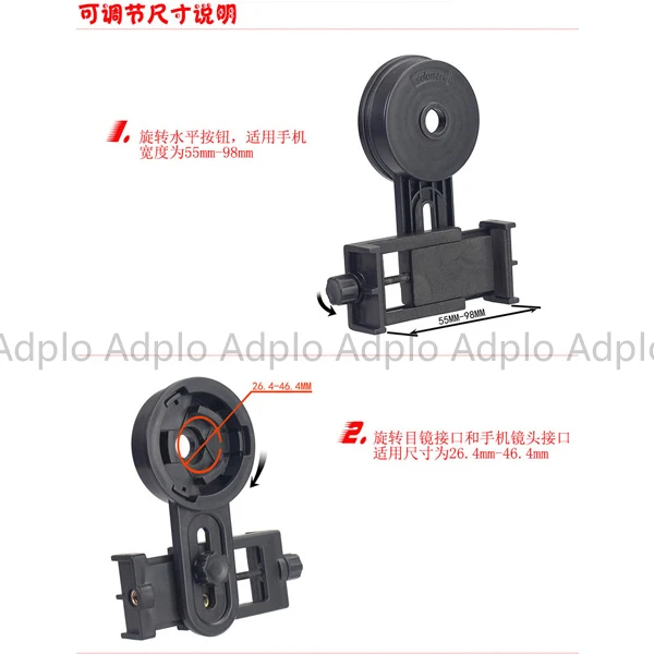 Suit for Cellphone for Mobile Phone Support Holder Adapter Suit For Telescope Spotting Scope Microscope Suit for Universal mobile phone clip support tripod mount Material: ABS green plastic Suit for Phone Width: 55-98mm Eyepiece diameter: 26.4-46.4mm Suit for Phone clip range: 5.5 - 10 Maximum adjustable height: 14cm installation steps: 1. Fixed knob fixed suit for phone for mobile phone to adjust the clearance lens center position 2. Fasten the buckle on the telescope aperture, turn the collar knob until fixed For a variety of models of suit for mobile phone connections, suit for telescope / binoculars shooting Precautions: Time slot 1. Do not use excessive force knob, to avoid damage to the knob 2. Some suit for phones will encounter when installing using buttons occlusion, can be placed in the bracket keys to adjust the position of the handle aligned with the outer suit for cell phone camera use Package includes: 1 x suit for Universal Mobile Phone Telescope Clip