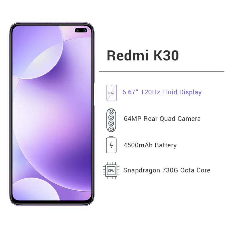 | Global ROM Xiaomi Redmi K30 8GB 256GB Smartphone Snapdragon 730G Octa Core 64MP Quad Camera 120HZ Fluid Display 4500mAh |