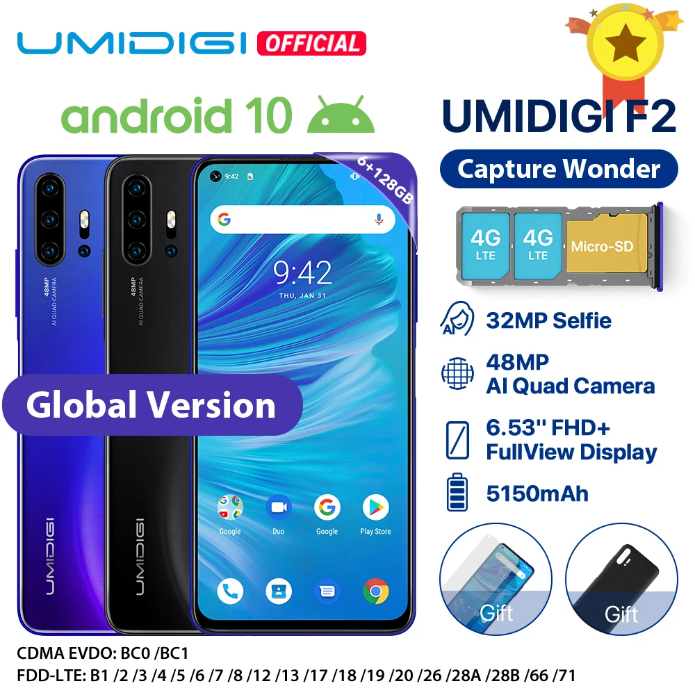 | IN STOCK UMIDIGI F2 Android 10 Global Version 6.53FHD+6GB 128GB 48MP AI Quad Camera 32MP Selfie Helio P70 Cellphone 5150mAh NFC |